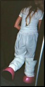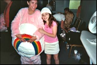 We were taught the choreography, a basic bare skeleton, in which we had to hit very fast, very sharp word cues. The "non-humans," as we were called, were pulled out one at a time for fittings. As I entered the fitting room, I noticed the huge kitty head kind of melted down on top of a pile of white fur, with a bunch of pink stuff sticking out. Flashing through my mind was sheer panic, as I thought, "What if I can't breathe in that thing?! What If I can't see or hear? What if I fall down?" I smiled and breathed through it. Working with the dresser, I slipped my pantaloons on. They were attached to the white fur fat kitty legs, with really cute but really big pink Mary Jane shoes attached. I lifted my leg...uh-oh!...My knee was lifted and bent and my foot was totally out of the shoe...and the pink kitty shoe was still on the floor. I thought to myself, with a bit of panic, how could I quickly make my feet four times their width and twice their length? Stuff the shoes with something! On to the next step, a padded fat body - next three: a lovely pink polyester dress with a rounded pink polka dot collar. I looked pretty, but kind of like I'd had an accident with one of those head hunters who used to shrink the heads - but mine was still attached to my body! Reminded me of the poor guy in "Beetlejuice." Uh-oh! Here comes the head! They placed the helmet, which was inside the unbelievably huge kitty head, on my head. Well, now at least my head was more in proportion with my body...however, I was very hot and could only see out of my nose...and my one and only view to the outside world was fogging up!!!