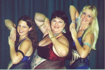 A dear friend of S.I.S., Sitara, of Raks Sahibat, performed next. She danced to a lively rhythm and blues piece. She chose this song because it reminds her to "celebrate and do it well". Her costume, fit her perfectly, with a black choli top, brightly colored gypsy-style skirt, accented with a fringe hip scarf. Her solo dancing is always heart-felt and reaches out to the audience and let's them experience, with her, the joy of the dance. Saiedeh, Sirens In Sanity co-director, performed "Lady Evil" by Black Sabbath. This alternative dance incorporated all of Saiedeh's distinctive stylings; flirtatious personality and playful audience contact, all the while executing proficient belly dance technique. The costume of "Lady Evil" was a tight black long sleeved dress with a full red and black lace skirt, layered fringe hip scarves and accented with silver jewelry. It seemed the audience really appreciated the spirit of the performance. To close the evening's festivities, there was a "monster" finale!