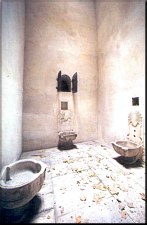 accent that I was looking for the bath. She jumped to her feet, a suprise in itself, because she had to be clocking in at about 250 lbs.! She quickly ushered me back to the women's entrance, led me to a room with a cot, bade me undress. I had bought some incredibly nice red lacy underwear, as sometimes they want you to wear it, sometimes they don't. In this case the answer was, "Oh, they are very pretty; no, they are not necessary" Just strip, lady. A bath sheet and a pair of wooden clogs were given me, and I was then ushered into the great room . The building where I was is about 400 years old, but the interior of the baths had been redone in the 90's . Glistening white marble rooms, all of them with domed ceilings with circular or diamond-shaped cutouts letting in the rays of the sun. Like most hamams, this one had a central pedestal, but instead of alcoves with marble sinks and flowing hot water, this one had actual private rooms off of the main one. I'm not sure whether