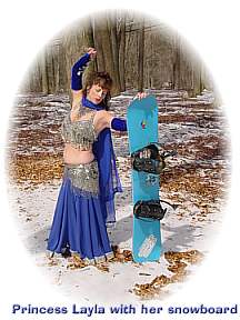 Gilded Serpent presents...Why Belly Dancers are Natural Snowboarders by Lauren Traub OK, it sounds strange. But If you’ve enjoyed dancing Oriental you probably already have a lot of the skills needed to snowboard. At least that’s what I have found in my personal experience. It’s probably too late to get on the snow this season, unless you go to the glacier at Blackcomb, B.C., or to Portillo, Chile in the Summer. But it’s not too early to start getting psyched to learn to snowboard next season. First of all, why snowboard? The answer: Because it is so much darn fun! I have just finished my third season of snowboarding. I am in my 40s. And I have never done anything as much fun in my rich and varied life! And, it is so cool to be a snowboarder. I have something in common now with people that I never would have met before. It might even give you something to talk about with your kids! Snowboarding gives you a great excuse to be outdoors in the winter. And you’ll be warm, too! It burns calories big time! If you’re thinking “but I can’t even ski,” fear not. I could never ski either, despite a lifetime of half-hearted attempts. Knowing how to ski may even be a detriment to snowboarding, because you will be fighting the “one board, sideways” paradigm. Admittedly, that’s strange for first time snowboarders too.