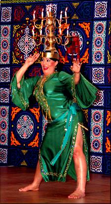 As Aida made her way towards the stage with the Shamadaan carried proudly on her head, she had a radiant smile on her face. A dancer, who loves to perform for an appreciative audience, had replaced the no-nonsense dance instructor. Aida's performance included several of the dances that she was teaching during the 3 days (including the Shamadaan and a Warda song she taught during the Master Class) and it was great to be able to see these wonderful choreographies performed in costume. We were feeling very satisfied with the evening's dance performances when Magdy came back for his final appearance. This time he insisted that participants in his Debke classes come up to the stage to help him out. It took a bit of work, but he finally ended up with 5 or 6 volunteers including Karen Barbee. They all threw themselves into a very energetic Debke following Magdy's lead. It got me all energized just watching them have so much fun. What a fabulous end to a great evening!. For all of the dancers who were able to come for this dynamic workshop, we took so much away from the 3-day exhausting but exhilarating weekend. It ended up being a great post-holiday boost plus a good start on a New Year's resolution to get more inspired and dance more in 2004! To be fair, I have to mention one complaint that I heard! One participant mentioned that she wished she could have taken all the classes that were offered from both dancers! So, I think that both Magdy and Aida need to come back to Texas again! Thanks once again to Dee Dee and Ahmad (aka Little Egypt) for bringing these 2 wondrful dancers to Texas! Have