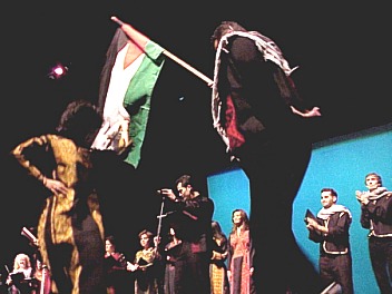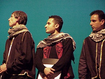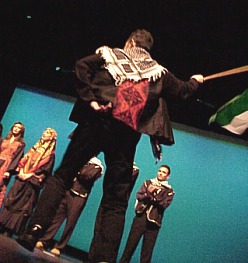 of Lorna's comments that night was an answer to a question many "How can you sing and dance when people are dying in the streets?" She answers herself, her own question, "How can you NOT dance? Both pain and pleasure are expressed through dance; every aspect of our existence is motivated, moving energy. Besides, the arts preserve culture and keep it alive instead of only having the bad memories left... Theater is a great dream, a sacred space where people bring their hopes, fears and imagination... the dream is to see Palestine live." |