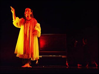 a black stage. A woman enters from oblivion, wild haired,